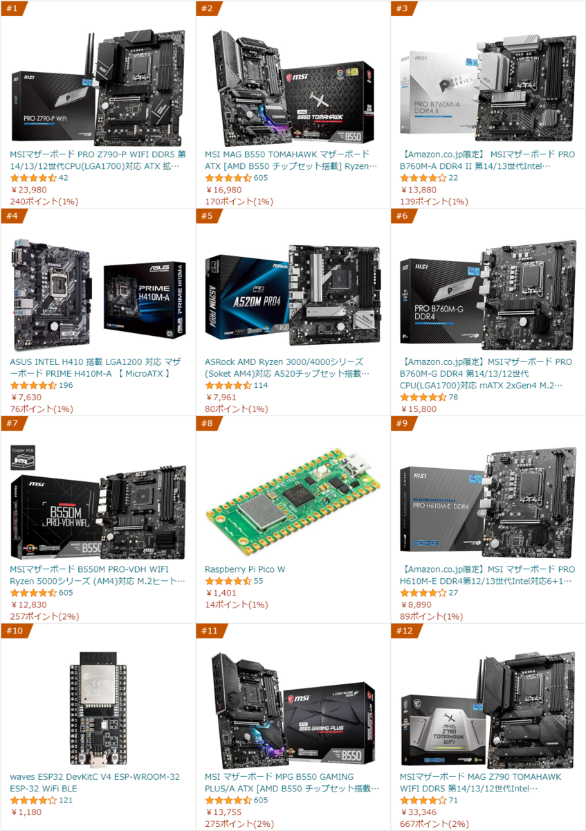 Amazonの売れ筋ランキングTOP12紹介記事。今回はマザーボード編です。購入する際の参考になれば幸いです。調査日時は2024年2月1日 0時頃のランキング。変動するランキング、また価格は調査当時のものとなります。ご注意ください。
